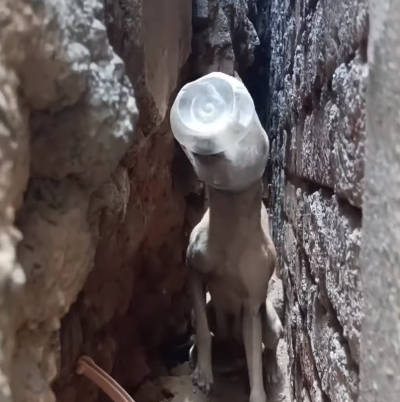 A small dog became trapped between two brick walls after getting his head stuck inside a discarded plastic container. Unable to see or free himself, he panicked and risked serious harm. Rescuers from the Animal Warriors Conservation Society responded carefully, using controlled techniques to secure the dog and remove the container without causing injury. Once freed, the dog immediately calmed and moved safely away. The incident highlights the hidden dangers of improperly discarded plastic waste and emphasizes the importance of crushing, flattening, and responsibly disposing of containers. Simple everyday actions can prevent serious harm and protect vulnerable animals.