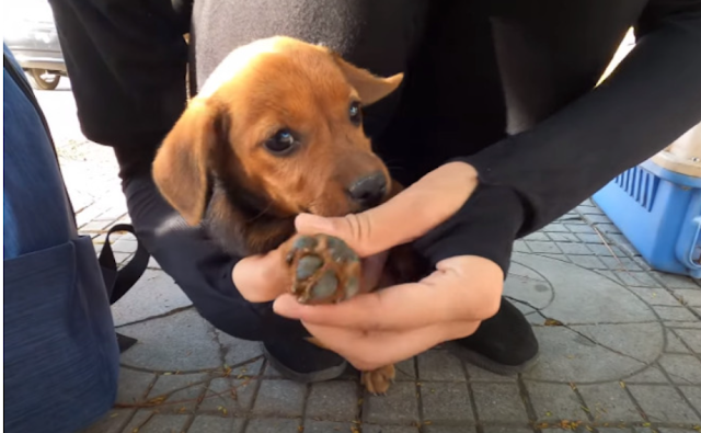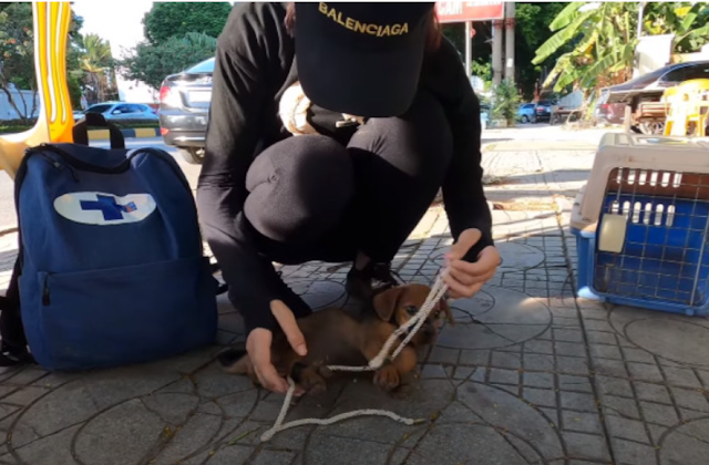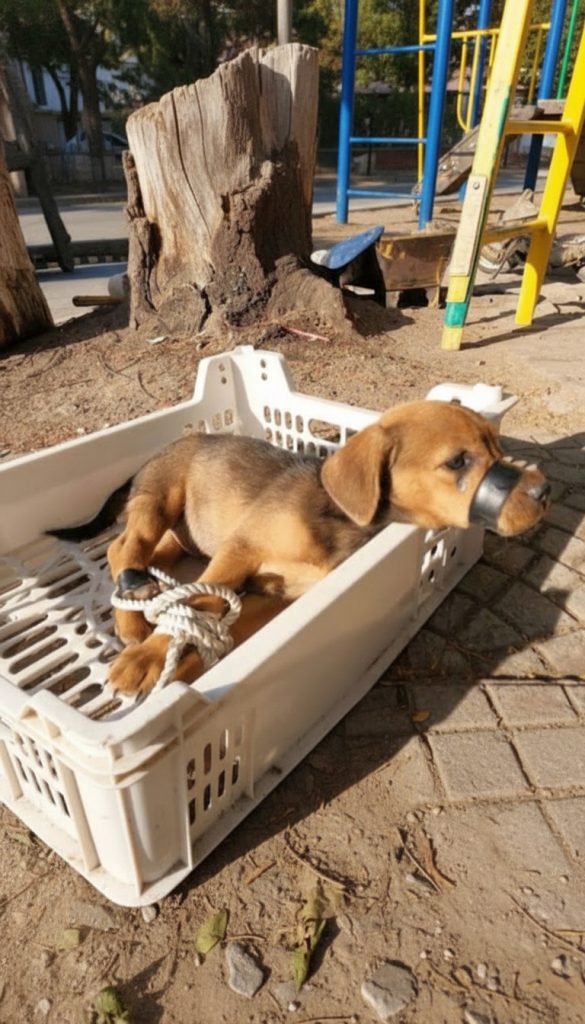 He stood rigid, painfully thin, as if every muscle was working overtime just to keep him upright. But it was his mouth that stopped everything. Wrapped tightly. Intentionally sealed. Preventing him from barking. From panting freely. From crying out.